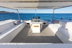 Front trampolines for sunbathing, a large shaded cockpit with seating for 20, onboard sound system, paddleboards, masks and snorkels, swim ladder, and onboard restroom. Fuel is included in all packages: no surprises when the bill comes. The crew takes care of everything—all you have to do is enjoy yourself.