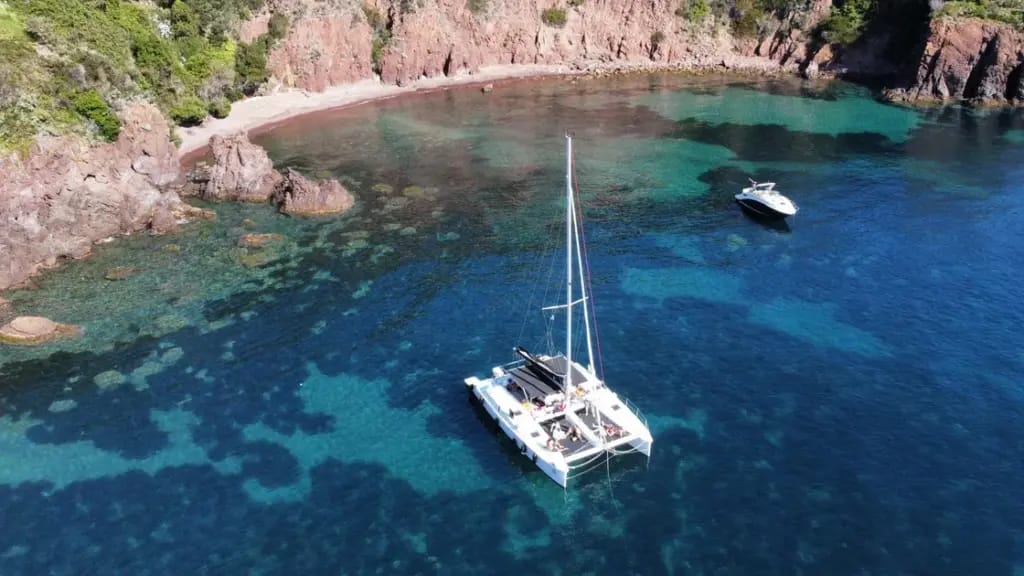 Privatisez le catamaran pour 3 heures au départ de Théoule-sur-Mer : bateau entier pour votre groupe jusqu’à 18 personnes, calanques de l’Estérel, masques, paddle et café inclus.